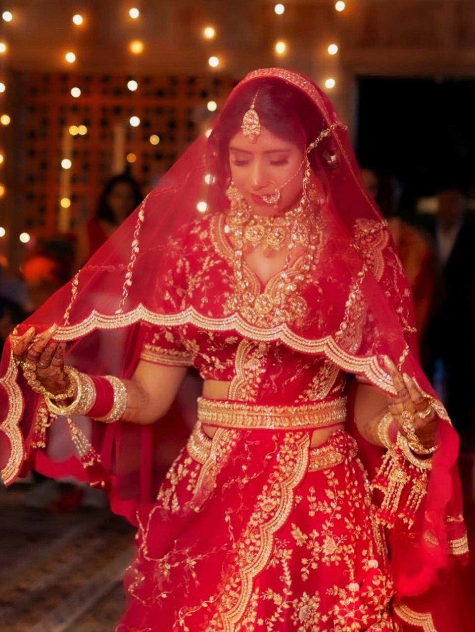 रेड लहंगा-चोली संग उन्होंने गले में हैवी नेकलेस पहना. मांग में टीका-नाक में नथनी पहने वो काफी खूबसूरत लगीं.