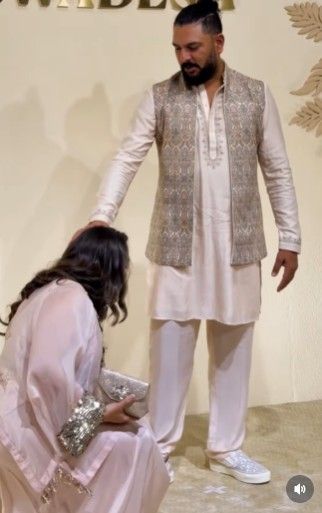 युवराज फिर फ्रेम में पत्नी संग पोज देने आए. जब वो फ्रेम में आए तो हेजल नीचे झुककर युवराज का पायजामा ठीक करने लगीं.