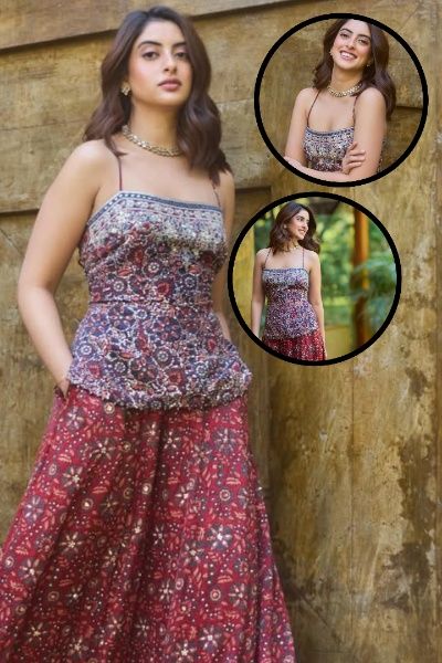 नव्या के शरारा पर हाथ से बनी अजरख ब्लॉक प्रिंट कला का बेहतरीन काम हो रखा है. गुजरात की इस पारंपरिक तकनीक में नेचुरल रंगों और मुश्किल प्रोसेस का इस्तेमाल होता है, जिसे पूरा होने में कई हफ्तों का समय लगता है.