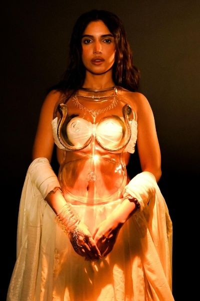 इस कॉरसेट को भूमि ने ब्रालेट के ऊपर पहना था. कॉरसेट को और भी अनोखा इस पर लगे ब्रोंज गोल्ड सांप बना रहे थे, जो भूमि को नागिन लुक दे रहे थे.