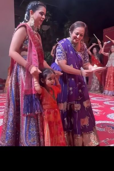 दरअसल, ईशा अंबानी खूबसूरत गुजराती लहंगा पहने अपनी नन्ही राजकुमारी आदिया और सास स्वाति के साथ गरबे की धुन पर ठुमकती दिखाई दीं.