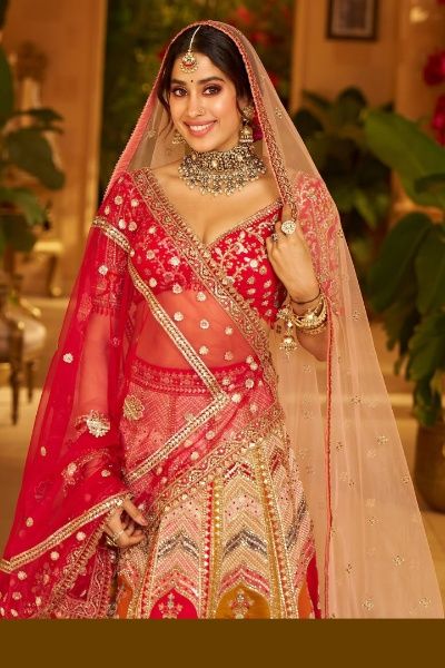 अपने लेटेस्ट लुक के लिए जाह्नवी दुल्हन बनी नजर आईं. उन्होंने इस दुल्हन लुक के लिए भारी-भरकम लाल रंग का लहंगा और जूलरी पहनी.