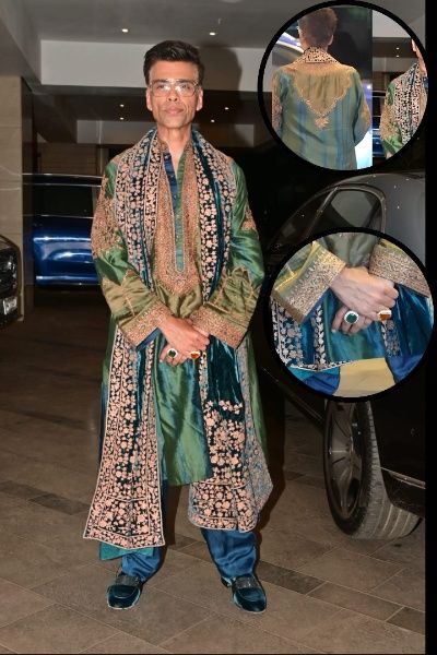 शाइनी फैब्रिक से बना करण का कुर्ता ग्रीन कलर का था, जिस पर बारीक-बारीक ब्लू कलर की लाइंस थीं. इतना ही नहीं कुर्ते की नेकलाइन और बैक को गोल्डन कढ़ाई से सजाया गया था.