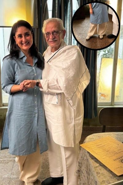 गुलजार साहब ने सफेद रंग का कुर्ता-पायजामा पहना है और उसके साथ गले में साफा डाला हुआ है. 91 साल के गुलजार साहब से मिलकर बेबो बहुत खुश नजर आ रही हैं.
