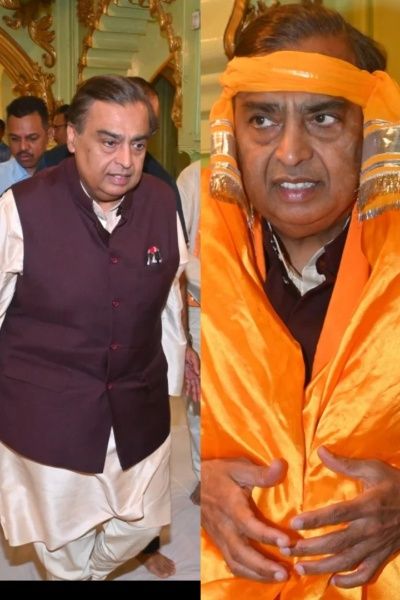 मुकेश अंबानी की जो तस्वीरें सामने आई हैं, उसमें उन्होंने माथे पर भगवा रंग की चुननी बांध रखी है और हंसते हुए फोटो क्लिक कराते दिख रहे हैं.