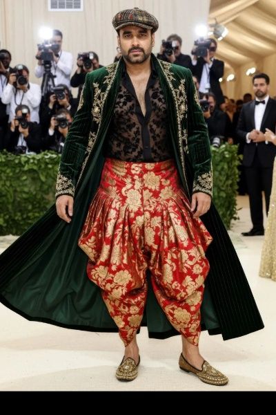 शर्ट और कोट को पंकज त्रिपाठी ने लाल धोती-स्टाइल ट्राउजर के साथ पेयर किया. ये ट्राउजर गोल्डन फूलों वाले ब्रोकेड कपड़े से बना है, जो पूरे लुक को रॉयल टच देने का काम कर रहा है.