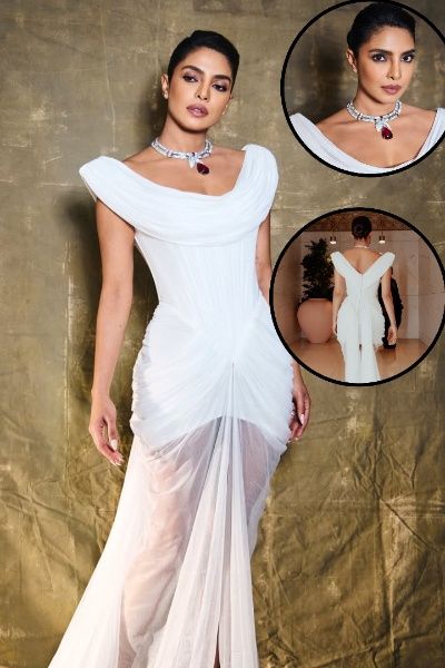 देसी गर्ल ने इवेंट के लिए Raisa Vanessa ब्रांड की वाइट सिल्क ट्यूल स्ट्रक्चरल ड्रेस पहनी. ड्रेस की काउल नेकलाइन और प्लीटेड पैटर्न प्रियंका के लुक में चार-चांद लगा रही थी.