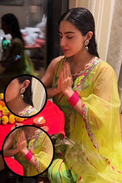 सारा ने हरे रंग का स्लीवलेस सूट पहन रखा है और दुप्पटे के एक कंधे पर डाला हुआ है. सारा के सूट के बॉर्डर पर गुलाबी रंग की लेस का काम है और डार्क ग्रीन कलर से पत्तियों का डिजाइन बना है.