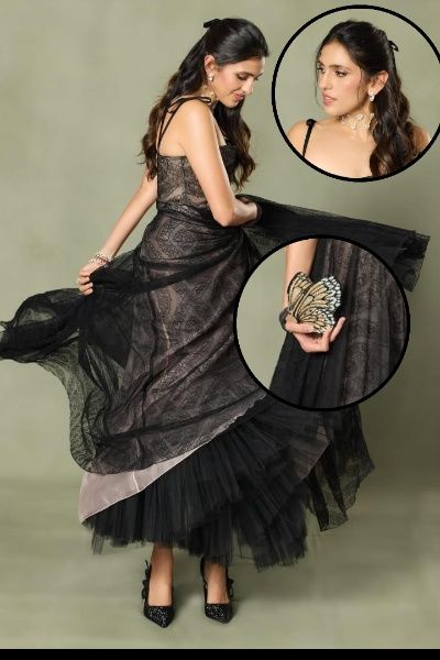 स्ट्रैपी लेस गाउन में अंदर की तरफ बेज कलर का प्रिंटेड फैब्रिक था, जिसके ऊपर की तरफ ब्लैक नेट फैब्रिक लगाकर इसे डिजाइन किया गया था.