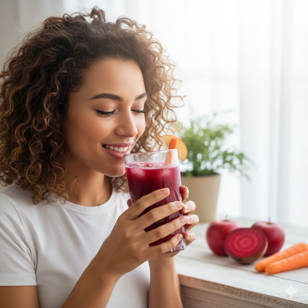 सेब, चुकंदर और गाजर से बना यह जूस विटामिन्स, मिनरल्स और एंटीऑक्सिडेंट्स से भरपूर होता है जो न सिर्फ त्वचा को ग्लोइंग बनाता है बल्कि शरीर को अंदर से डिटॉक्स भी करता है.