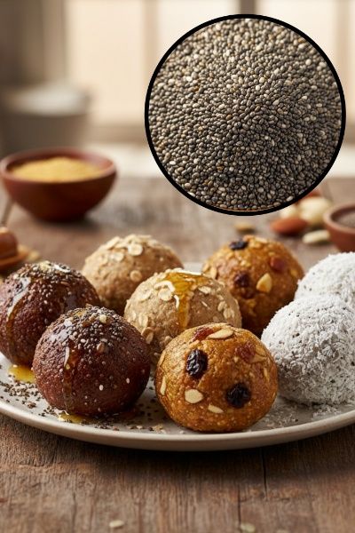 इस बिना चीनी वाले लड्डू में नारियल का बुरादा और भीगे हुए चिया सीड्स मिलाए जाते हैं. नारियल में मौजूद नेचुरल फैट्स और चिया सीड्स का फाइबर इस लड्डू को हेल्दी स्नैक्स बनाता है.