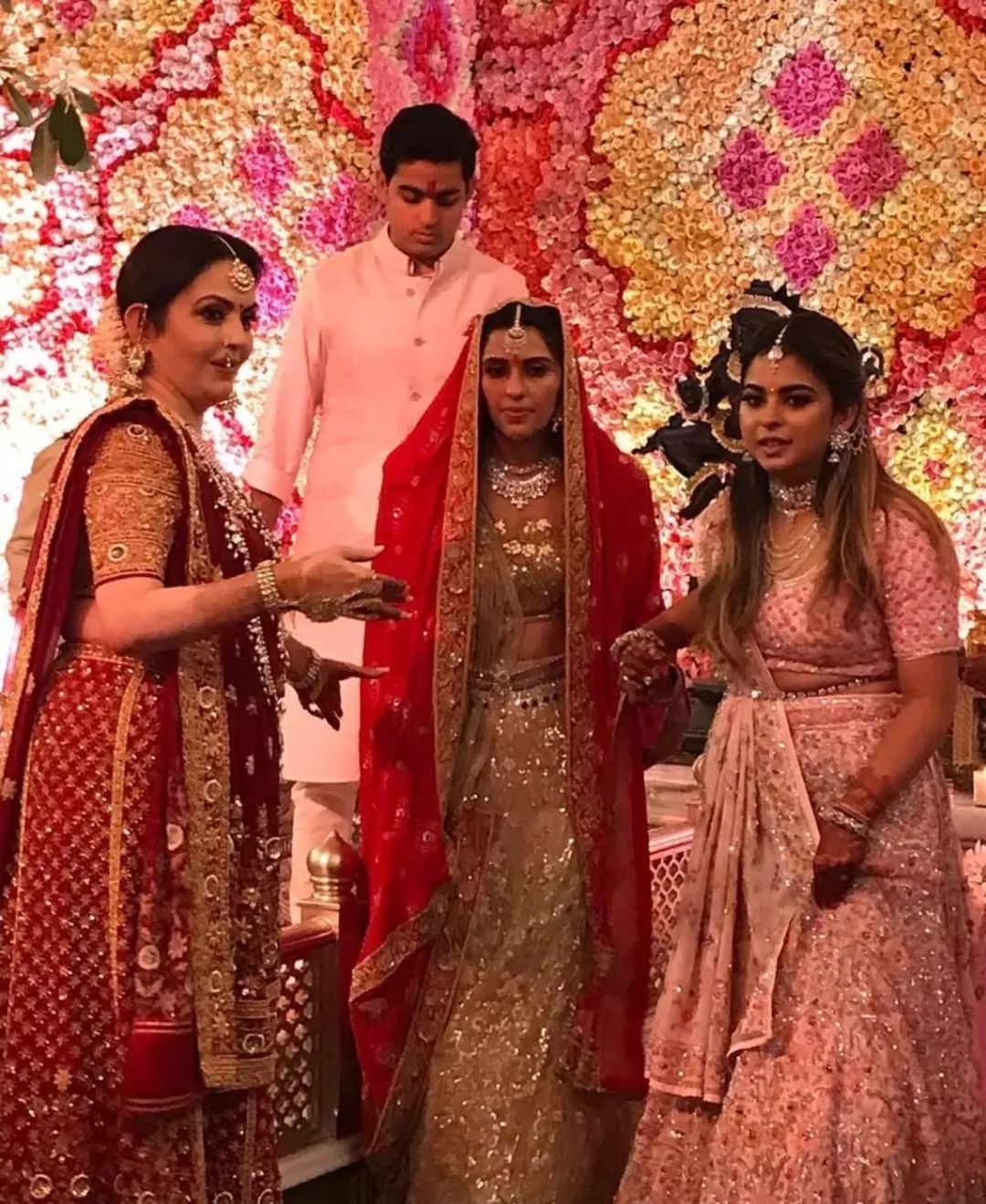 नीता अंबानी ने इस मौके पर मरून-गोल्डन साड़ी पहनी थी जबकि ईशा ने लाइट गुलाबी रंग का लहंगा पहना था.