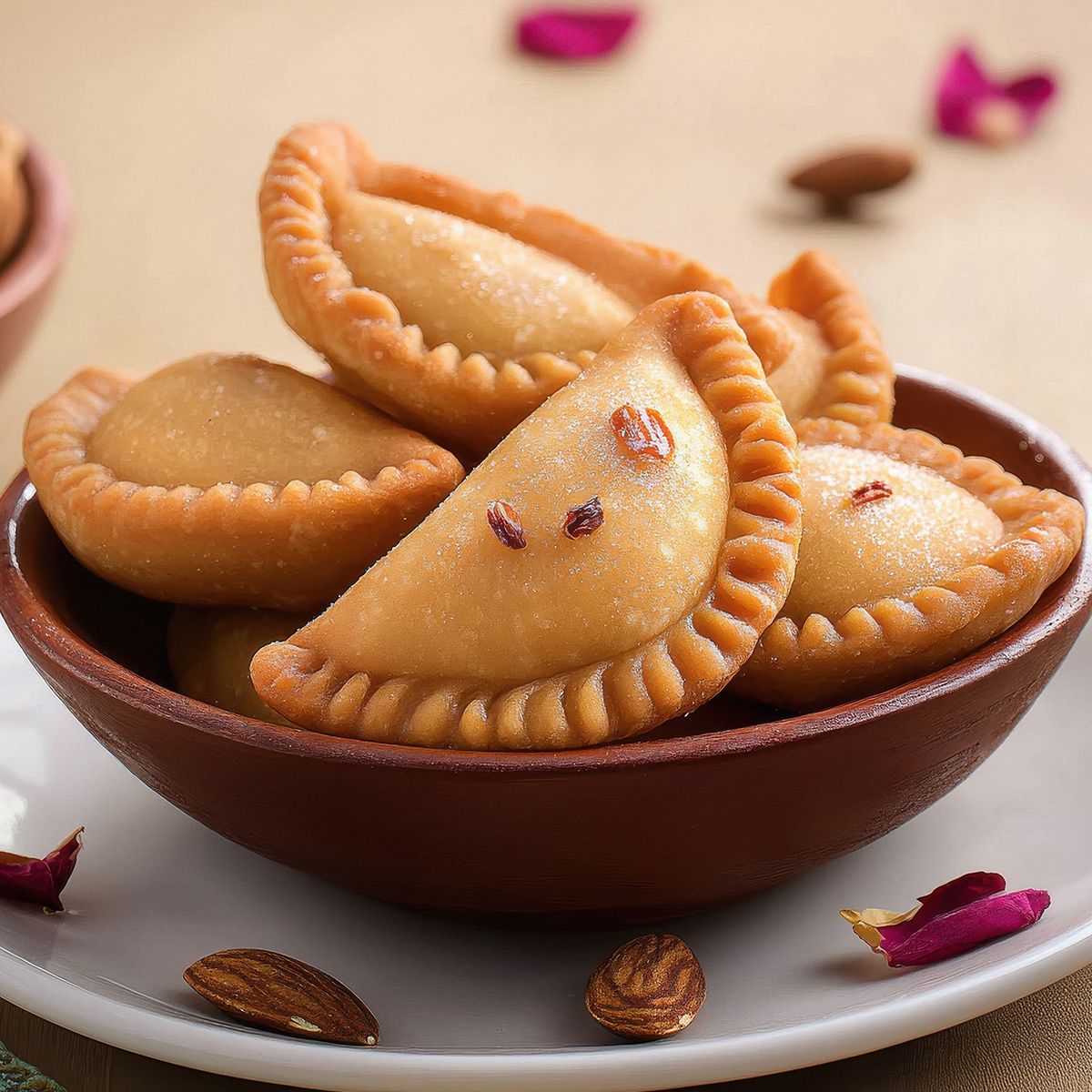 इन गुजिया को आप कम घी में 'एयर फ्राई' (Air Fry) कर सकते हैं या ओवन में 180°C पर सुनहरा होने तक बेक कर सकते हैं. यदि चाहें तो देसी घी में हल्का फ्राई भी कर सकते हैं.