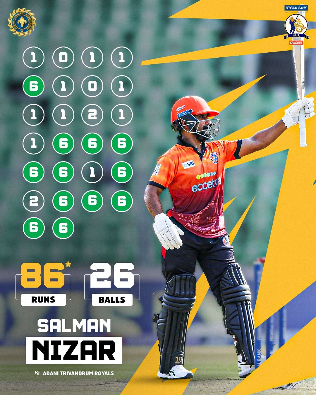 सलमान ने पारी के 19वें ओवर में लगातार 5 छक्के लगाए. बासिल थम्पी के उस ओवर में कुल 31 रन (6, 6, 6, 6, 6, 1) आए.
