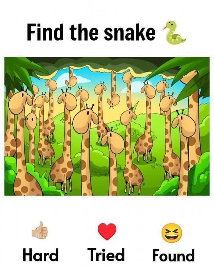 इस तस्वीर में कई जिराफ दिखाई दे रहे हैं और उनके बीच कहीं सांप छिपा हुआ है. आपका काम है उस छिपे हुए सांप को ढूंढना.