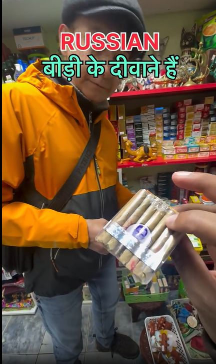 एक रूसी शख्स दुकान पर आता है और स्टोर से बीड़ी खोजकर निकालता है. वीडियो बना रहा शख्स उस बीड़ी के पैकेट को दिखाता है.