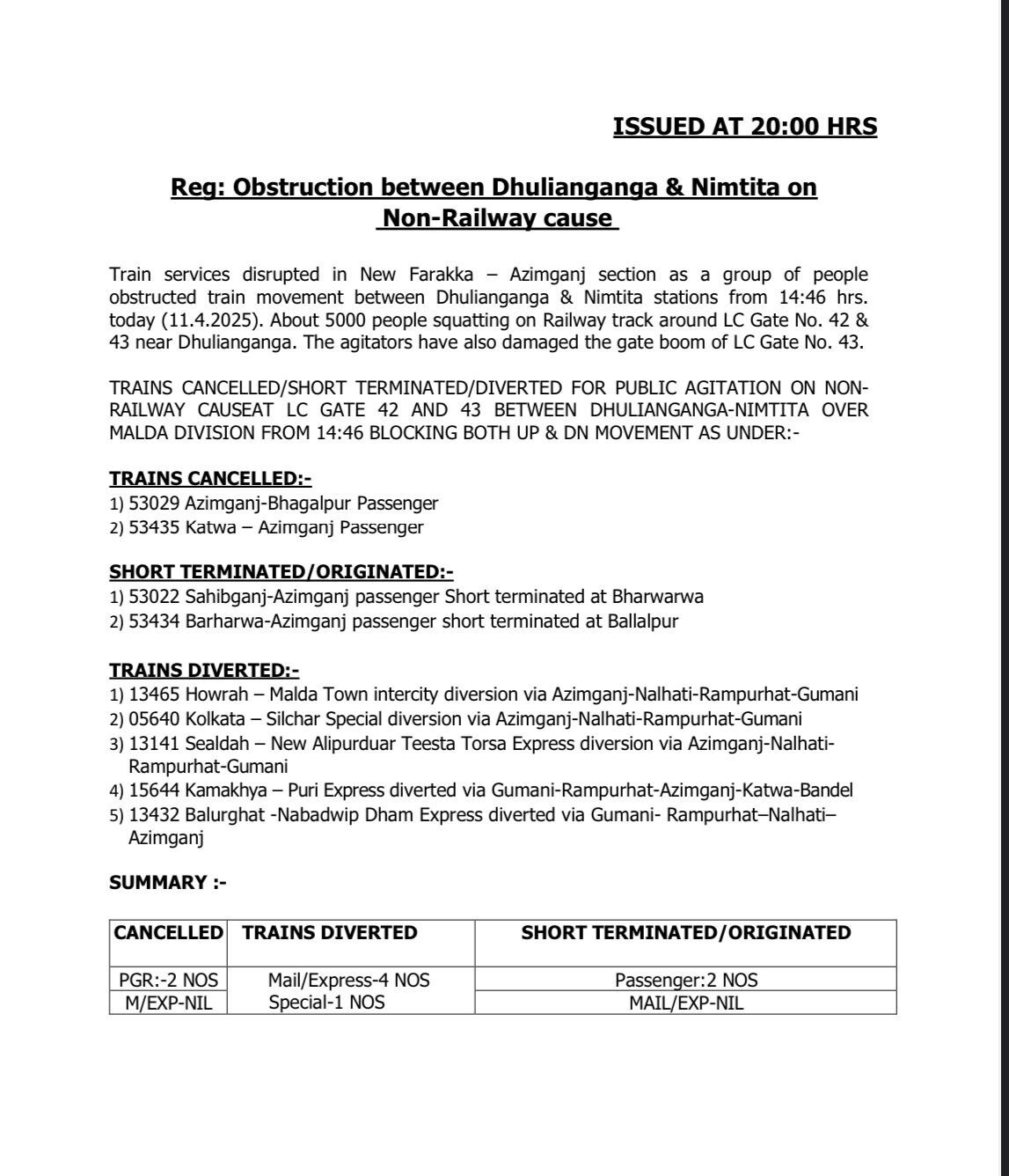 हिंसा की वजह से धुलियानगंगा और निमटीटा रेलवे स्टेशन के बीच ट्रेन सेवा बाधित हो गई. भारतीय रेलवे ने जानकारी दी कि न्यू फरक्का-अजीमगंज रेल खंड पर रेलवे सेवा बाधित हो गई. लगभग 5000 प्रदर्शनकारी लोगों ने रेलवे ट्रैक पर कब्जा कर लिया. ये प्रदर्शनकारी एलसी गेट नंबर 42 और 43 के पास बैठ गए. 53029 अजीमगंज-भागलपुर पैसेंजर और 53435 कटवा-अजीमगंज पैसेंजर ट्रेन रद्द कर दी गई. वहीं, पांच ट्रेनों को डायवर्ट कर दिया गया. इनमें 13432 बालुरघाट-नबद्वीप धाम एक्सप्रेस, 15644 कामाख्या-पुरी एक्सप्रेस, 13141 सियालदह-न्यू अलीपुरद्वार तीस्ता तोर्सा एक्सप्रेस, 05640 कोलकाता-सिलचर स्पेशल और 13465 हावड़ा-मालदा टाउन इंटरसिटी शामिल हैं.