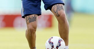 एक शख्स के पैर में गुदा बर्ट रेनॉल्ड्स और 'वेयर द वाइल्ड थिंग्स आर'. ये शख्स अपने कुत्ते के साथ डोवर में 20 जून 2015 में फायर फ्लाई म्युजिक फेस्टिवल में पहुंचा.