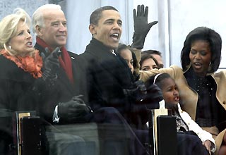 रविवार 18 जनवरी, 2009 को वाशिंगटन के लिंकन मेमोरियल में एक समारोह के दौरान अमेरिका के नवनिर्वाचित राष्ट्रपति बराक ओबामा, मिशेल ओबामा, उप राष्ट्रपति के लिए निर्वाचित जोए बिडेन, जिल बिडेन और साशा ओबामा.