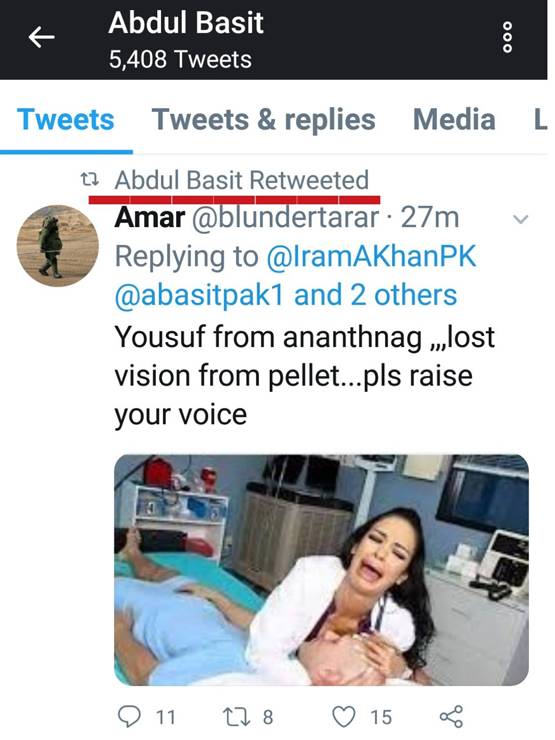 दरअसल, अब्दुल बासित ने जिस ट्वीट को रिट्वीट किया था उसमें पोर्नस्टार जॉनी सिन्स की तस्वीर थी जिसे कश्मीरी पीड़ित बताया गया था. इस फेक तस्वीर पर अब्दुल बासित की फजीहत हुई तो ये खबर सोशल मीडिया पर सेंसेशन बन गई. इसी के बाद पोर्न की एक फेमस वेबसाइट ने इस मसले पर ट्वीट किया और लिखा कि जॉनी के लिए दुआ कीजिए.