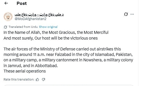 ये स्ट्राइक सुबह 11:00 बजे इस्लामाबाद में फैजाबाद के पास एक मिलिट्री कैंप, नौशेरा कैंट, जमरूद मिलिट्री कॉलोनी और एबटाबाद को टारगेट करके किए गए. अफगानिस्तान के रक्षा मंत्रालय ने कहा कि ऑपरेशन में खास मिलिट्री बेस, कमांड सेंटर और स्ट्रेटेजिक जगहों पर हमला किया गया, और इसे पिछली रात काबुल, कंधार और पक्तिया में कथित पाकिस्तानी हवाई घुसपैठ का सफल जवाब बताया.