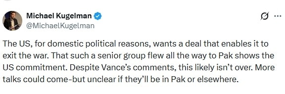 बातचीत फेल होने के बावजूद विदेश नीति पर नजर रखने वाले माइकल कुगेलमैन ने कहा, "US, घरेलू राजनीतिक कारणों से, एक ऐसी डील चाहता है जिससे वह युद्ध से बाहर निकल सके. इतने सीनियर ग्रुप का पाकिस्तान तक आना US के कमिटमेंट को दिखाता है. वेंस के कमेंट्स के बावजूद, शायद यह अभी खत्म नहीं हुआ है. और बातचीत हो सकती है - लेकिन यह साफ नहीं है कि वे पाकिस्तान में होंगी या कहीं और."