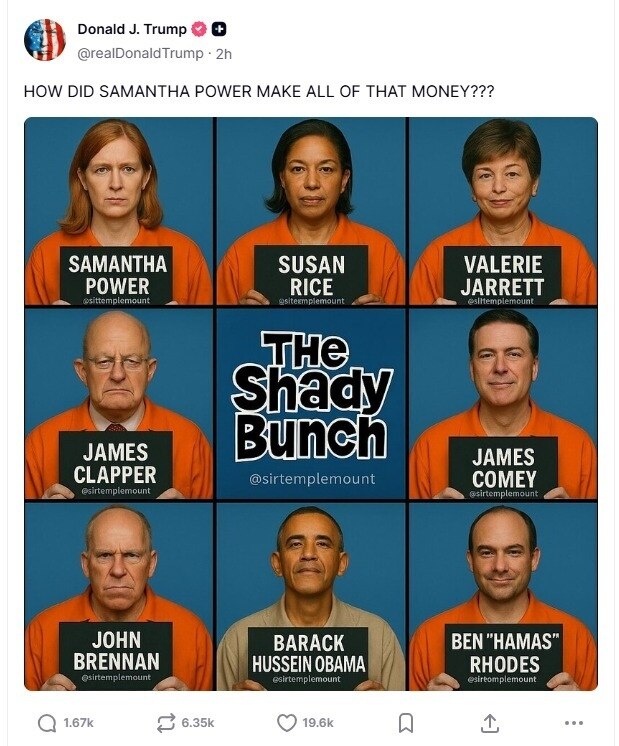 कुछ दिन पहले ही ट्रंप प्रशासन ने 2016 के चुनाव में ओबामा पर चुनावी धोखाधड़ी का आरोप लगाया था. अब इस वीडियो के जरिए ट्रंप ने एक बार फिर ओबामा पर सीधा हमला बोला है. ट्रंप ने इनके अलावा एक क्रिएटिव इमेज शेयर किया है जिसमें पूर्व ओबामा एडमिनिस्ट्रेशन के नेताओं को दिखाया गया है, जिसमें उन्हों पूछा, "सामन्था पावर ने इतना सारा पैसा कैसे कमाया???"