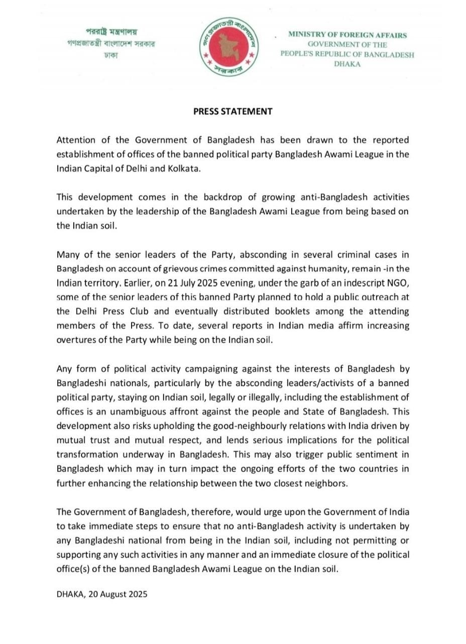 बांग्लादेश ने बयान जारी कर कहा कि यह घटनाक्रम उस पृष्ठभूमि में हुआ है जब पार्टी के कई वरिष्ठ नेता भारत में रहते हुए बांग्लादेश विरोधी गतिविधियों को अंजाम दे रहे हैं. इनमें से कई नेता बांग्लादेश में मानवता के खिलाफ गंभीर अपराधों के मामलों में वांछित हैं और फरार चल रहे हैं.