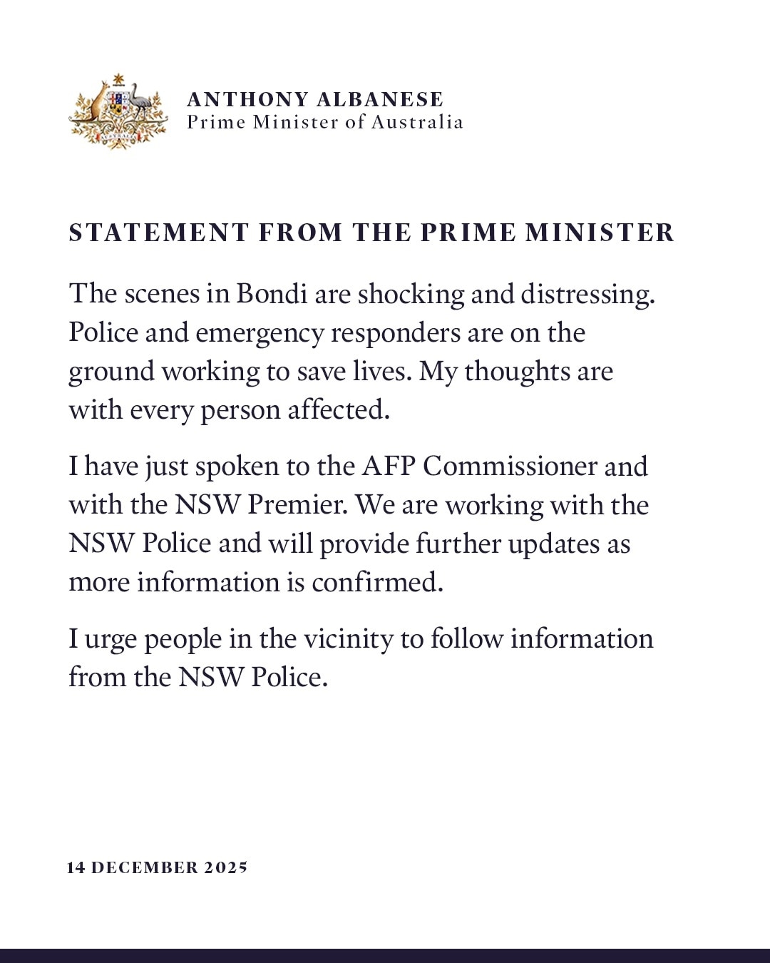 उन्होंने बोंडी बीच में हुए हमले को “विनाशकारी आतंकी घटना” बताया है. उन्होंने कहा कि यह हमला यहूदी ऑस्ट्रेलियाई नागरिकों को निशाना बनाकर किया गया और यह खुला हुआ यहूदी-विरोधी (एंटी-सेमिटिक) कृत्य है.