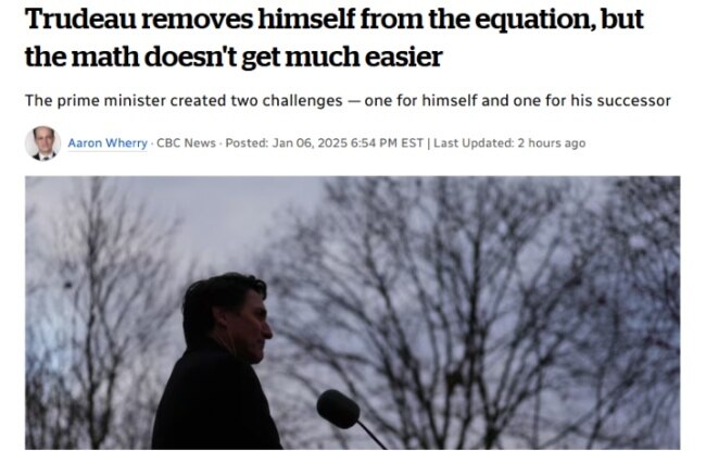 कनाडा के न्यूज ब्रॉडकास्टर सीबीसी ने अपने एक विश्लेषणात्मक लेख को शीर्षक दिया है- ट्रूडो ने समीकरण से खुद को बाहर कर लिया है लेकिन सवाल की जटिलता कम नहीं हुई है (Trudeau removes himself from the equation, but the math doesn't get much easier).