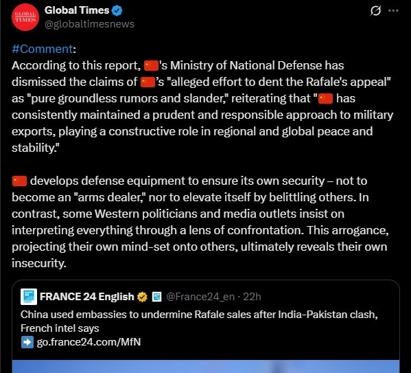 चीन ने फ्रांस की उस खुफिया रिपोर्ट को खारिज किया है जिसमें कहा गया था कि पाकिस्तान के खिलाफ भारत के ऑपरेशन सिंदूर के बाद चीन ने राफेल फाइटर जेट के खिलाफ प्रोपेगैंडा कैंपेन शुरू किया था. चीन के रक्षा मंत्रालय ने खुफिया रिपोर्ट को पूरी तरह से निराधार बताते हुए कहा है कि यह अफवाहों पर आधारित है जो चीन को बदनाम करती है.