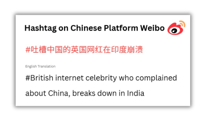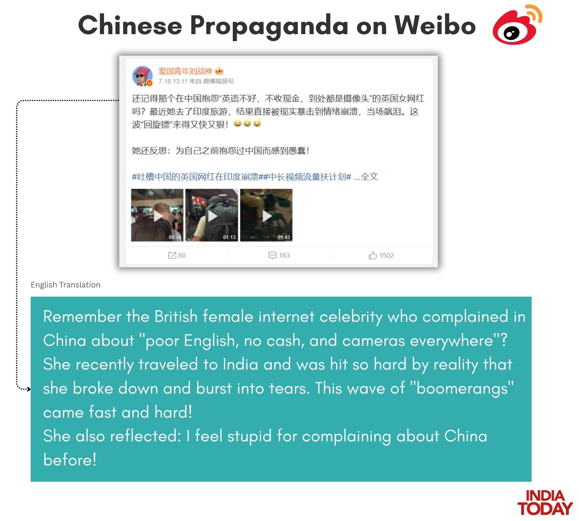 भारत के खिलाफ चीन की तरफ से यह कैंपेन 17 जुलाई को वीबो पर एक ब्रिटिश इंफ्लूएंसर की तरफ से शेयर किए गए वीडियो क्लिप से शुरू हुआ जो चीन के बाद भारत घूमने आया था. इस क्लिप के साथ चीनी भाषा में एक हैशटैग भी लिखा जिसका मतलब है- ब्रिटिश इंटरनेट सेलिब्रिटी जिसने चीन के बारे में शिकायत की, भारत में रो पड़ी.' इसमें वो रोते हुए कहती है, 'चीन के बारे में शिकायत करना अब मुझे बेवकूफी लगता है.'