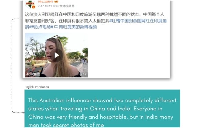 हालांकि, चीनी प्रोपेगैंडा में केवल उसी हिस्से को उठाया गया जहां इंफ्लूएंसर हैरेसमेंट की शिकायत कर रही थी.