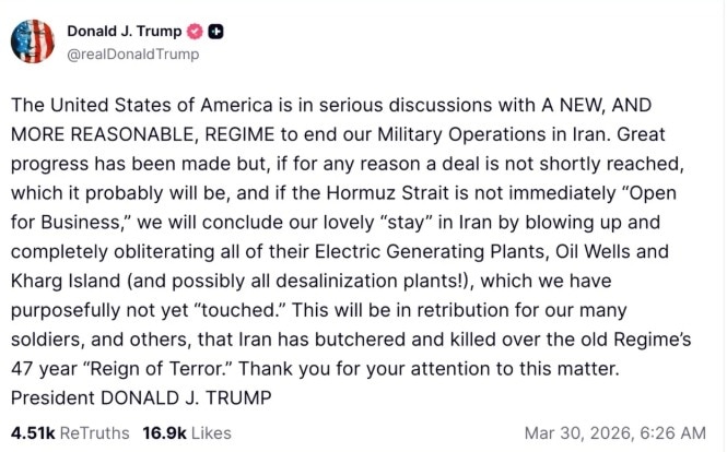 24 मार्च को तो ट्रंप ने साफ तौर पर कह दिया कि "हम यह जंग जीत चुके हैं." लेकिन अगले ही दिन उन्होंने चेतावनी दी कि अगर समझौता नहीं हुआ तो अमेरिका ईरान के ऊर्जा और पानी के ढांचे को "तबाह" कर सकता है. 26 मार्च को उन्होंने कहा कि "ईरान हार चुका है", लेकिन इसके बावजूद सैन्य कार्रवाई जारी रही.
