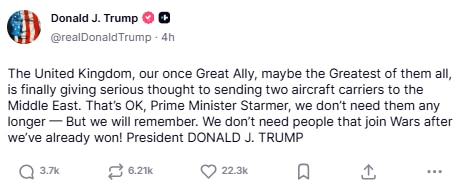 ट्रंप ने अपने सोशल मीडिया प्लेटफॉर्म 'ट्रुथ सोशल' पर ब्रिटेन के प्रधानमंत्री कीर स्टार्मर पर तंज कसते हुए लिखा, 'यूनाइटेड किंगडम, हमारा पूर्व महान सहयोगी, शायद उन सब में सबसे महान, आखिरकार मिडिल-ईस्ट में दो एयरक्राफ्ट कैरियर भेजने के बारे में गंभीरता से विचार कर रहा है.'