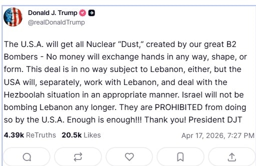 ट्रंप ने ट्रूथ सोशल पर एक पोस्ट में दावा किया कि, "U.S.A. को हमारे शानदार B2 बॉम्बर्स से पैदा हुई सारी न्यूक्लियर "Dust" मिलेगी." ट्रंप ने आगे कहा कि इस सौदे में किसी भी तरह से, किसी भी रूप में, पैसों का कोई लेन-देन नहीं होगा. यह सौदा किसी भी तरह से लेबनान से भी जुड़ा हुआ नहीं है, लेकिन US अलग से लेबनान के साथ काम करेगा और हिज़्बुल्लाह की स्थिति से उचित तरीके से निपटेगा."