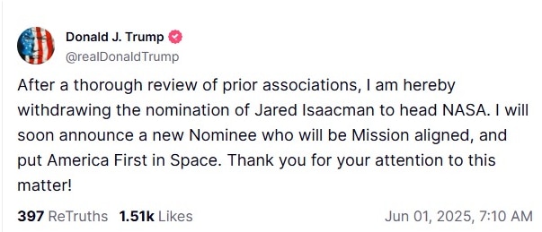 ट्रंप ने जेरेड का नॉमिनेशन वापस लेने का ऐलान करते हुए सोशल मीडिया पर एक पोस्ट साझा की है. जिसमें उन्होंने लिखा, 'पिछले जांचों के बाद मैं नासा के प्रमुख के रूप में जेरेड इसाकमैन के नॉमिनेशन को वापस ले रहा हूं. मैं जल्द ही नए उम्मीदवार की घोषणा करूंगा जो मिशन से जुड़ा होगा और स्पेस में अमेरिका को प्राथमिकता देगा.'