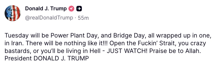 राष्ट्रपति ट्रंप ने अपने सोशल मीडिया पर एक पोस्ट लिखी जो पूरी दुनिया में चर्चा का केंद्र बन गई है. उन्होंने कहा कि मंगलवार को ईरान में 'पावर प्लांट डे' और 'ब्रिज डे' होगा. यानी साफ धमकी कि ईरान के बिजली घरों और पुलों पर हमले होंगे.