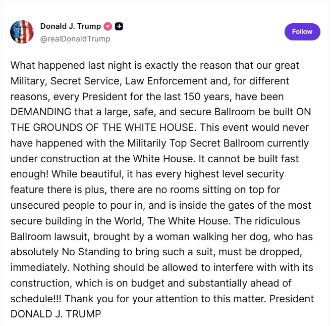 अमेरिकी राष्ट्रपति डोनाल्ड ट्रंप ने कहा कि उन्होंने व्हाइट हाउस के मैदान पर एक सुरक्षित बॉलरूम यानी बड़ा कार्यक्रम हॉल बनाने की जोरदार वकालत की है. उन्होंने कहा कि पिछली रात जो घटना हुई वो इस बात का सबूत है कि ये बॉलरूम क्यों जरूरी है. साथ ही उन्होंने उस मुकदमे पर भी गुस्सा जताया जो इस निर्माण को रोकने की कोशिश कर रहा है. ट्रंप ने कहा कि ये काम तय समय से पहले और बजट के अंदर चल रहा है.