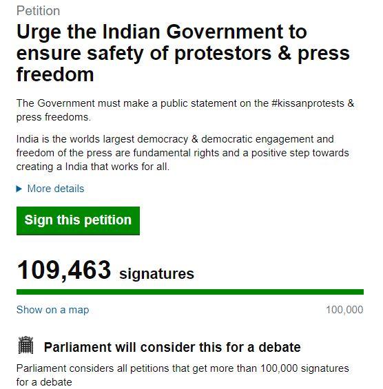 भारत में जारी किसान आंदोलन को लेकर जो याचिका दायर की गई, उसपर करीब 1 लाख 10 हजार के करीब साइन किए जा चुके हैं. ऐसे में अब ब्रिटिश संसद की पेटिशन कमेटी किसान आंदोलन पर चर्चा करने पर विचार कर सकती है. साइन करने वालों की लिस्ट में बोरिस जॉनसन का नाम होने का भी दावा किया गया, लेकिन वहां के प्रधानमंत्री कार्यालय ने इससे इनकार किया है.