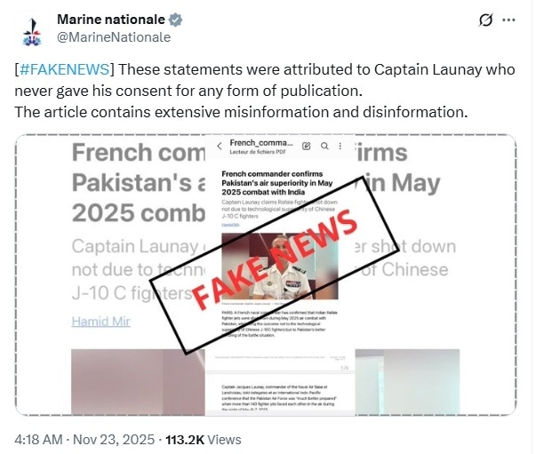 फ्रांसीसी नौसेना ने अब पाकिस्तान के इस झूठ की पोल खोलते हुए PAK के दावे को फर्जी खबर करार दिया और कहा, 'ये बयान कैप्टन लाउने के हवाले से दिए गए हैं, जिन्होंने किसी भी तरह के प्रकाशन के लिए अपनी सहमति नहीं दी. लेख में व्यापक रूप से गलत और भ्रामक सूचनाएं हैं.'