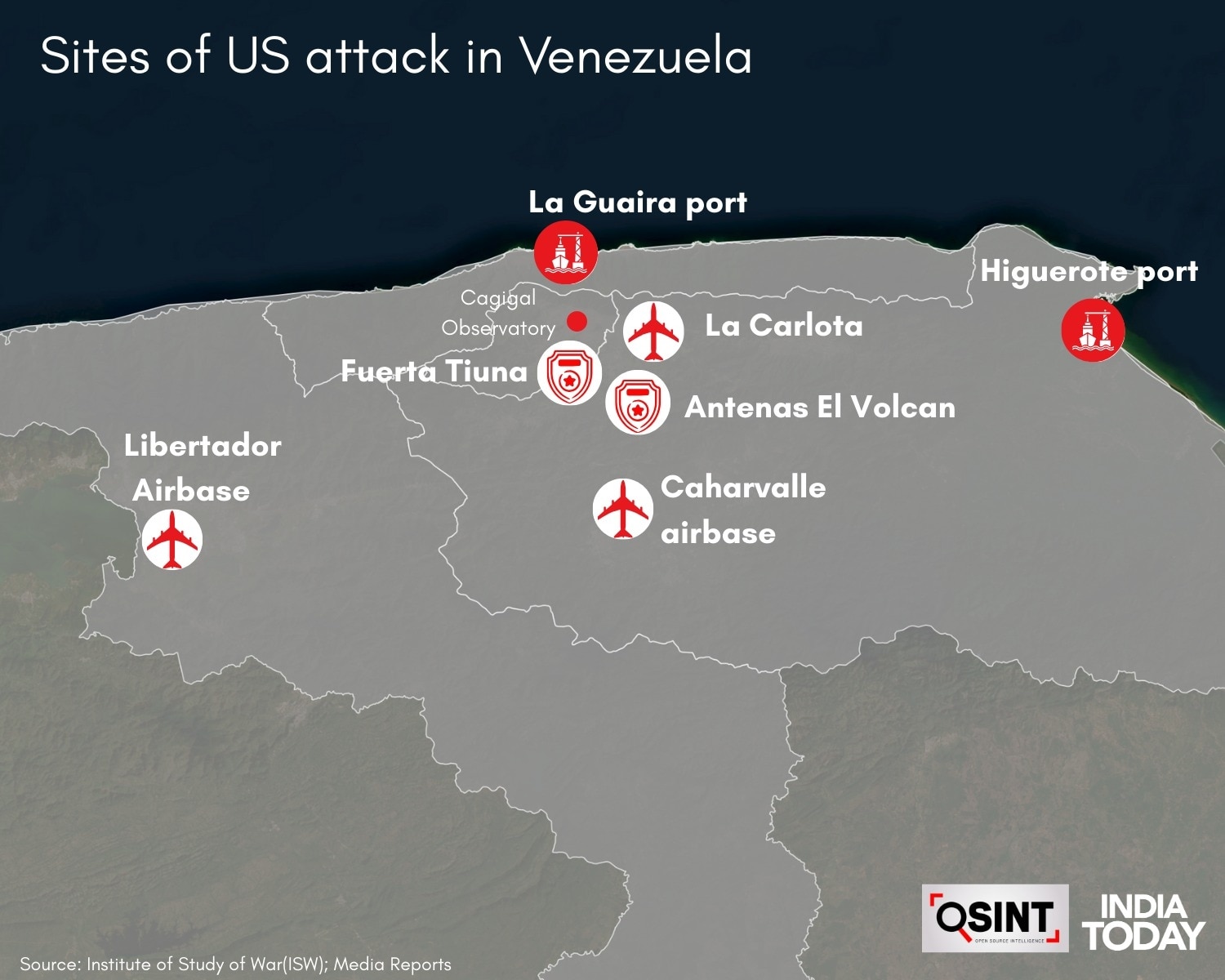 रिपोर्ट्स के मुताबिक, कम से कम 8 बेहद अहम ठिकानों को निशाना बनाया गया. इनमें बंदरगाह, सैन्य ठिकाने, एयरबेस आदि पर हमले जिन जगहों पर हुए, उनमें हिगुएरोटे और ला गुआइरा के पोर्ट, ला कार्लोटा, लिबर्टाडोर और काहरवाल्ले एयरबेस शामिल हैं. कराकस के ला कार्लोटा एयरबेस पर रूस से मिले BUK मिसाइल सिस्टम को भी तबाह कर दिया गया.