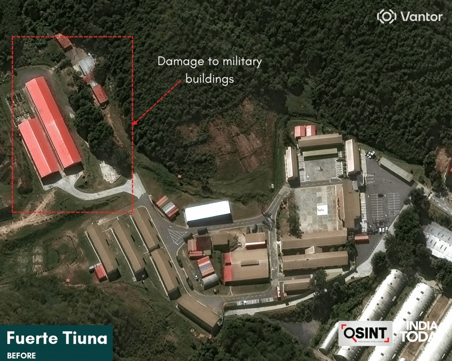 अमेरिका की सैटेलाइट कंपनी वेंटर की तस्वीरों में उस सैन्य ठिकाने पर हमला साफ दिखता है जो बंकर के ठीक पास स्थित था. ओवरव्यू में फुएर्ते तिउना परिसर के अंदर तीन अलग-अलग जगहों पर हुए हमले नजर आते हैं.