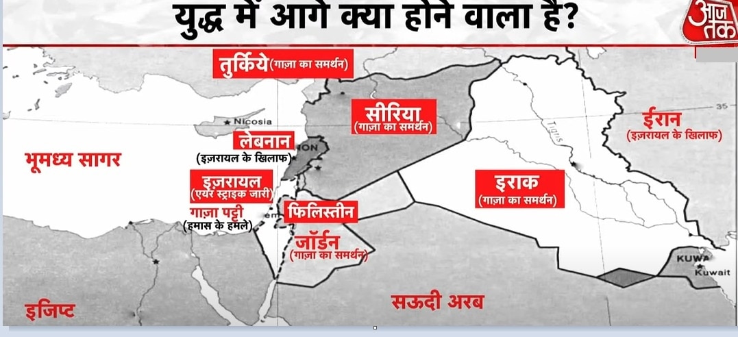 एक तरफ तो ईरान, हिज्बुल्ला को हमास के समर्थन में आगे बढ़ा रहा है, दूसरी अरब देशों के साथ पूरी सेटिंग भी कर रहा है. इजरायल के नक्शे के इर्द गिर्द देखिए, एक तरफ तो भूमध्य सागर है, कहा जा रहा है कि वहां अमेरिका ने अपना युद्धपोत तैनात कर दिया है. इजरायल के एक कोने पर गाज़ा पट्टी है, तो पूरा फिलिस्तीन इजरायल से सटा है. इसके अलावा एक तरफ इजिप्ट है, जो इजरायल के समर्थन में है. लेबनान, सीरिया, जॉर्डन से इजरायल की सीमाएं लगी हुई हैं. सीरिया से तुर्किये की सीमा लगी हुई हैं, जॉर्डन और सीरिया से ईराक और सउदी अरब भी सटा हुआ है और ज़ाहिर सी बात है ईरान, इजरायल के खिलाफ जो युद्ध के कई मोर्चे खुलने की बात कर रहा है वो यहीं से खुल सकते हैं.