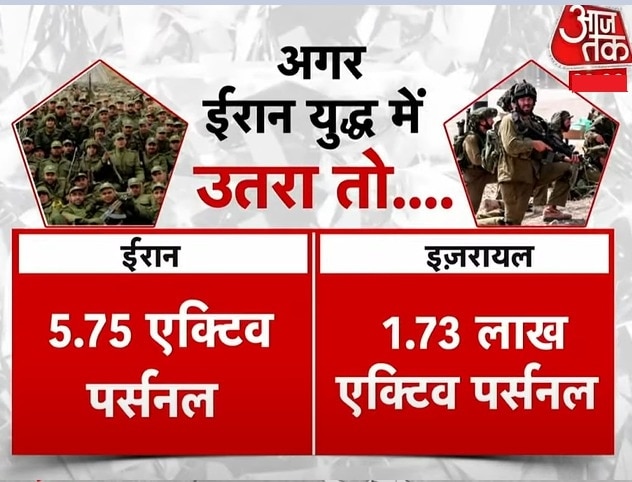 - ईरान 4 करोड़ लोगों को तुरंत सेना में भर्ती कर सकता है. जबकि इजरायल के पास 31.11 लाख लोग ही इसके लायक हैं. ईरान की सेनाओं में 5.75 लाख एक्टिव पर्सनल हैं. जबकि इजरायल के पास 1.73 लाख एक्टिव पर्सनल हैं.