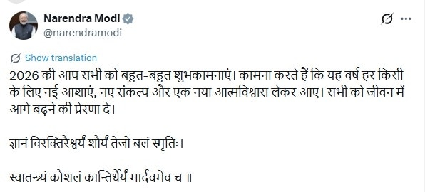 प्रधानमंत्री नरेंद्र मोदी ने नए साल के मौके पर देशवासियों को बधाई संदेश दिया है. उन्होंने सोशल मीडिया पोस्ट में लिखा, "सभी को 2026 की बहुत-बहुत शुभकामनाएं. आने वाला साल आपके लिए अच्छा स्वास्थ्य और समृद्धि लाए, आपके प्रयासों में सफलता मिले और आप जो भी करें, उसमें आपको संतुष्टि मिले. हमारे समाज में शांति और खुशी के लिए प्रार्थना."