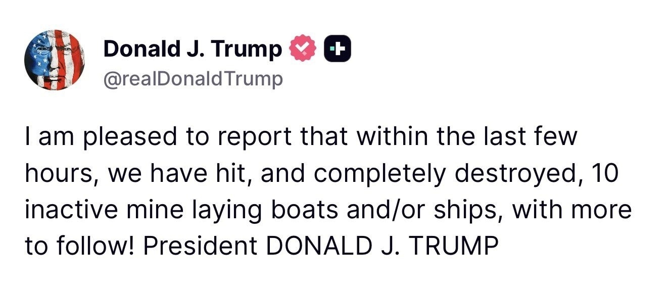 अमेरिकी राष्ट्रपति डोनाल्ड ट्रंप ने सोशल मीडिया पोस्ट कर ईरान पर हमले की जानकारी दी है. ट्रंप ने कहा कि मुझे ये बताते हुए खुशी हो रही है कि बीते कुछ घंटों के भीतर हमने माइन बिछाने वाली ईरान की 10 इनएक्टिव नौकाओं और जहाजों को निशाना बनाकर उन्हें पूरी तरह से नष्ट कर दिया है. ऐसे हमले आगे भी जारी रहेंगे.
