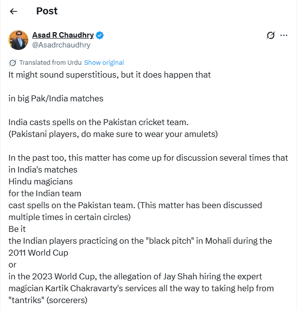 चौधरी अपने ट्वीट में लिखते हैं, 'ये अंधविश्वास जैसा लग सकता है, लेकिन ऐसा होता है कि बड़े भारत-पाकिस्तान मैचों में भारत, पाकिस्तान की क्रिकेट टीम पर जादू करता है. (पाकिस्तानी खिलाड़ियों, अपने ताबीज जरूर पहन लेना) पहले भी कई बार यह मामला चर्चा में आ चुका है कि भारत के मैचों में भारतीय टीम के लिए हिंदू तांत्रिक पाकिस्तान टीम पर जादू करते हैं.'