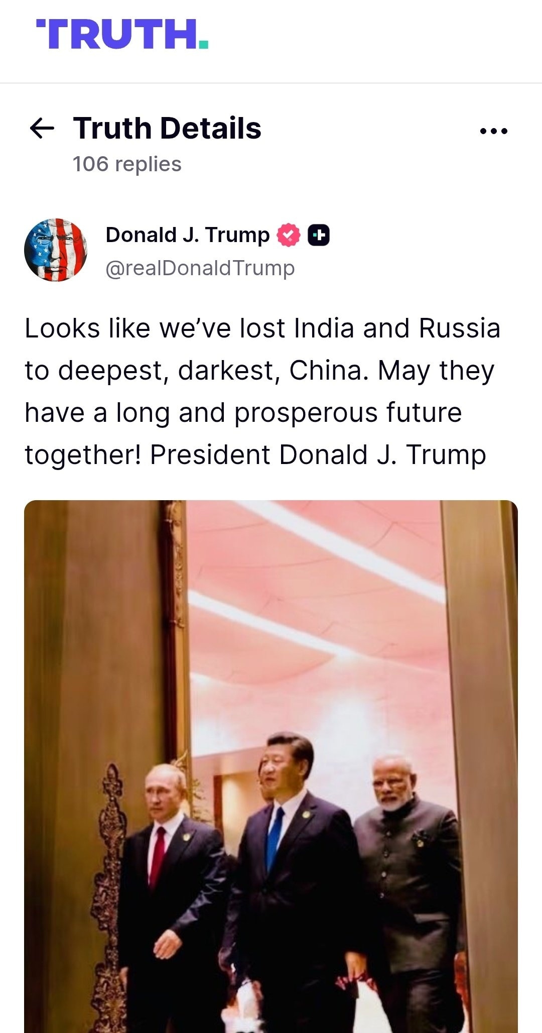 टैरिफ पर तनातनी के बीच डोनाल्ड ट्रंप ने भारत और रूस को लेकर बड़ा बयान दिया है. अपने ट्रुथ सोशल मीडिया पोस्ट पर डोनाल्ड ट्रंप ने लिखा कि लगता है कि हमने भारत और रूस को खतरनाक चीन के हाथों खो दिया है. डोनाल्ड ट्रंप ने अपने पोस्ट के साथ SCO में राष्ट्रपति जिनपिंग, पुतिन और प्रधानमंत्री मोदी की तस्वीर पोस्ट की है. ट्रंप ने लिखा कि उम्मीद है कि उनका साथ लंबा और समृद्ध हो.