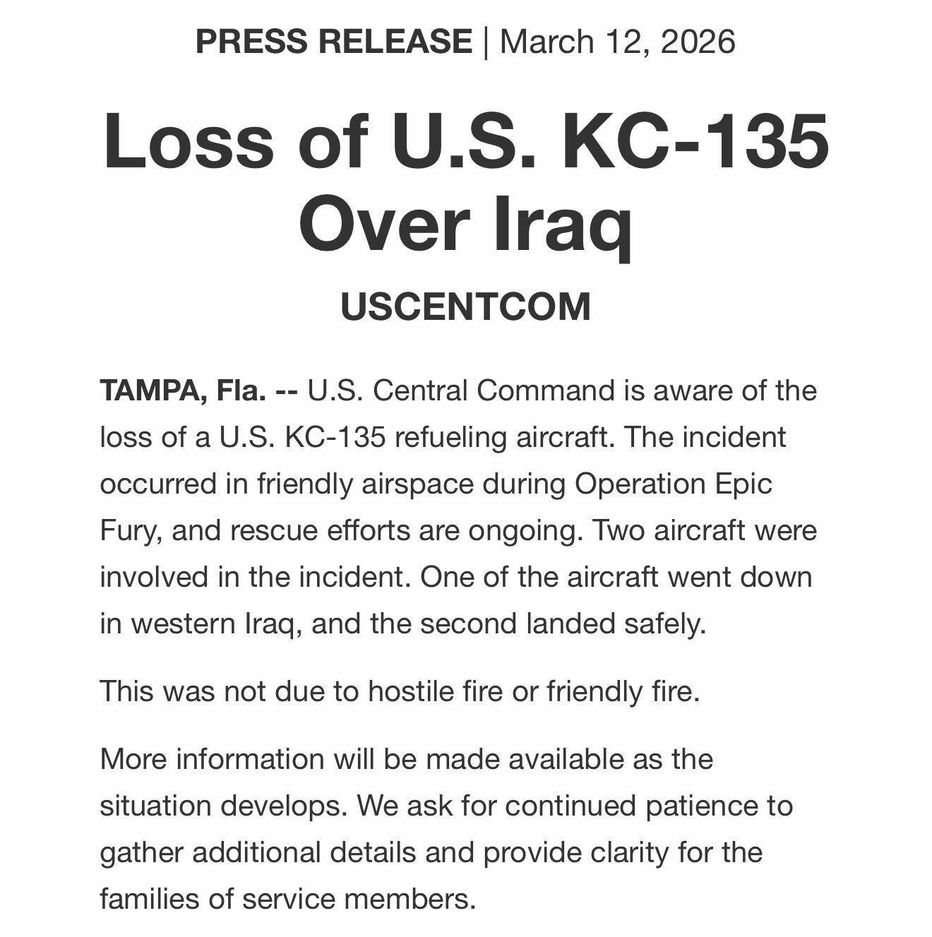 अमेरिकी सेंट्रल कमांड ने गुरुवार को बताया कि ईरान के साथ जारी जंग के बीच इराक के फ्रेंडली एयरस्पेस में एक सैन्य विमान क्रैश हो गया. सेना ने जारी बयान में कहा कि इस घटना में दो विमान शामिल थे. एक विमान पश्चिमी इराक में गिर गया, जबकि दूसरा सुरक्षित रूप से उतरने में सफल रहा. कमांड ने यह भी स्पष्ट किया कि यह घटना न तो दुश्मन की गोलीबारी के कारण हुई और ना ही मित्र देशों की फायरिंग के कारण हुई है.